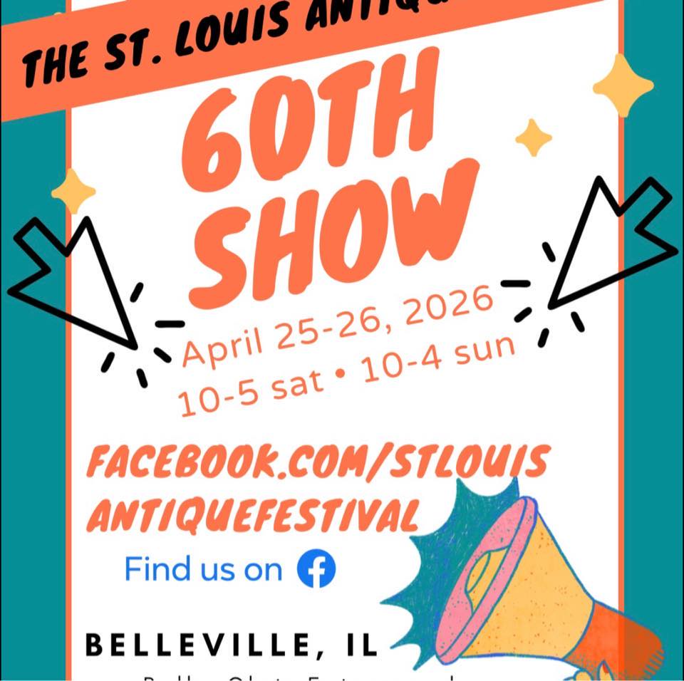Website StLouisAntiqueFestival.com Location Belle Clair Fairgrounds Park 200 South Belt E Belleville, IL 62220 Contact Name: Dorrine Mawkinney Phone: 608-346-3797 Web site: StLouisAntiqueFestival.com Join us for our 60th Show! April 25th & 26th: Saturday 10AM - 5PM & Sunday 10AM - 4PM Admission $6, Free Parking Find beautiful accent pieces with character — from Asian-inspired pottery and chippy old cabinets to fine antique jewelry and mid-century gems from the 1960s. These aren’t reproductions; they’re authentic pieces with stories to tell and dealers who love to share them! Known as the Midwest’s premier antique show, we welcome dealers, collectors, and treasure hunters alike. See you soon! Get Directions using Google MapsSend Email to Event ContactBAF51978-1365-4A60-B923-0B16C01718A1